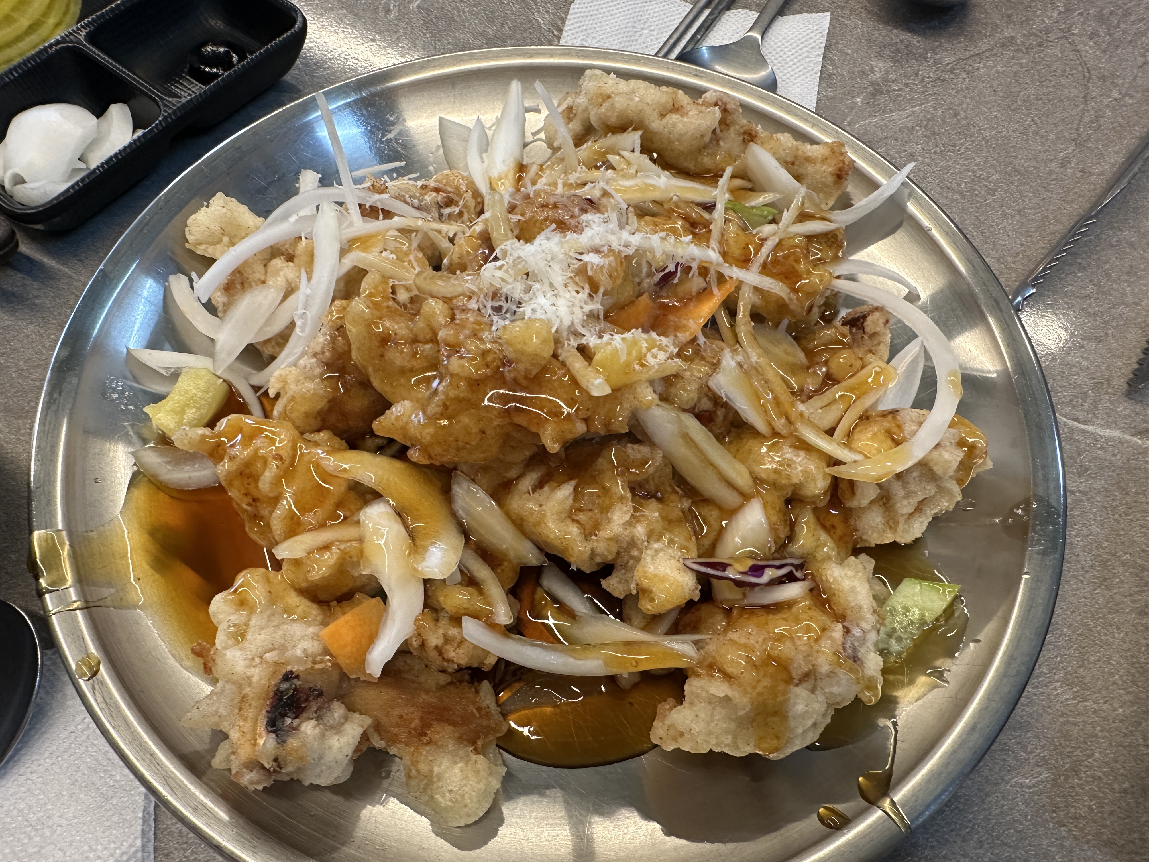 드디어 등장한 문어탕수육! 보기만 해도 군침이 도는 비주얼이었어요.