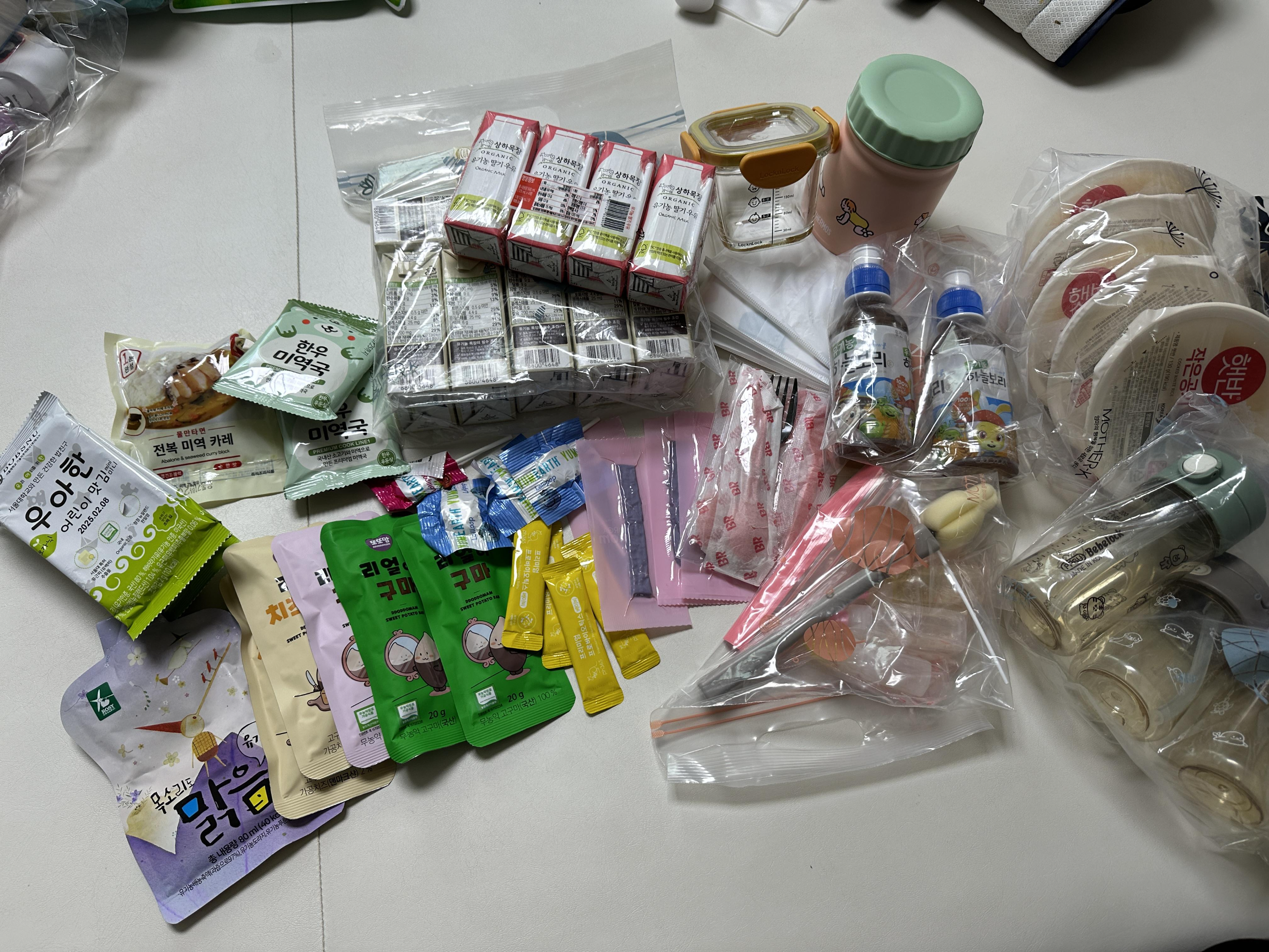 ✔️ 간식 (보리차, 딸기우유, 주스, 마들렌, 고구마, 육포, 김, 자일리톨, 비타민)