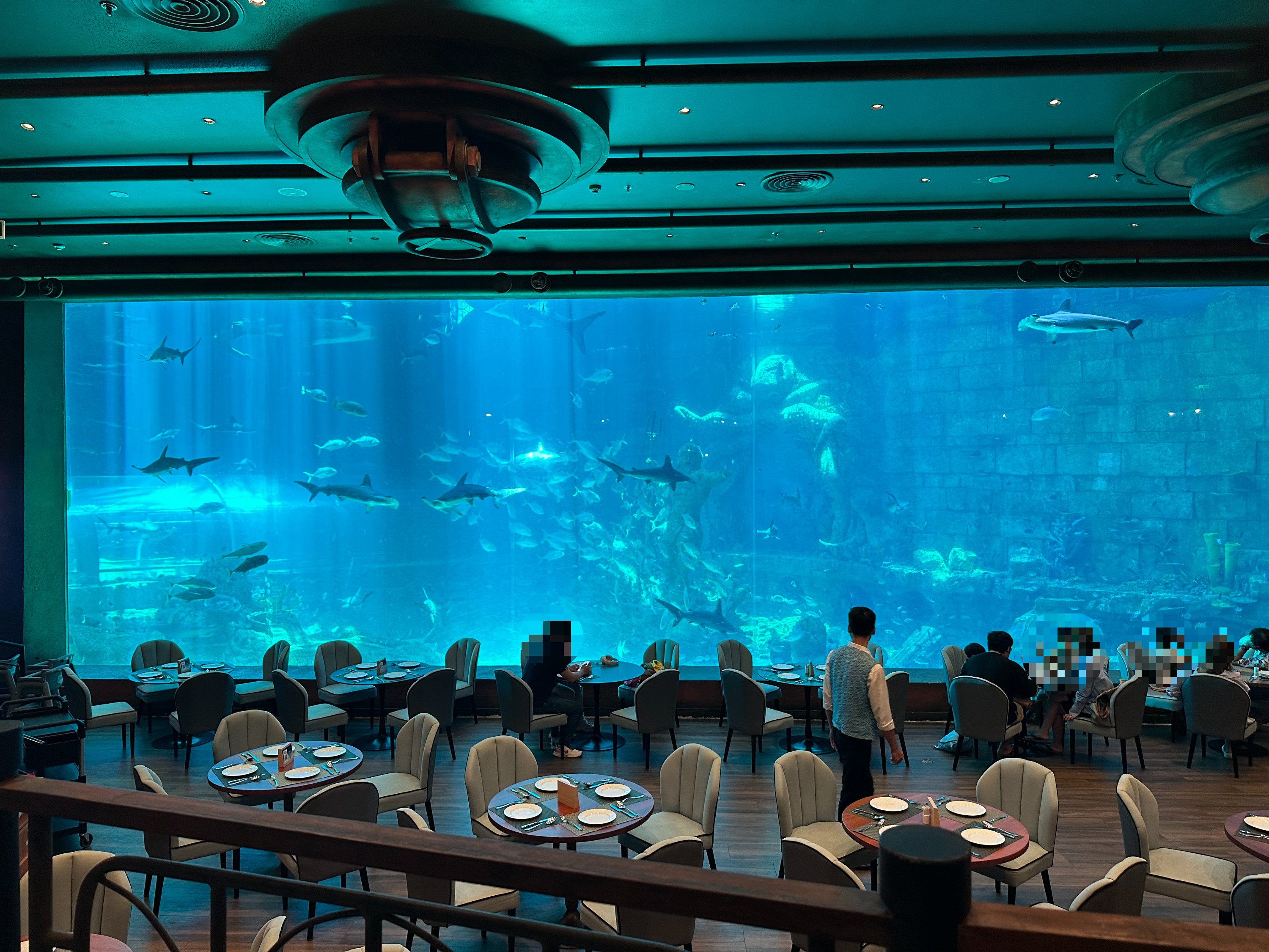 식탁 옆으로 상어와 다양한 해양 생물이 유유히 헤엄치는 모습을 보며 식사를 할 수 있어요.